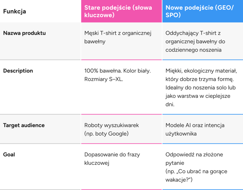 Celem nie jest już dopasowanie ciągu znaków z zapytania użytkownika. Celem jest pomóc modelowi AI naprawdę zrozumieć produkt: czym jest, dla kogo jest, dlaczego ma znaczenie i w jakim kontekście się sprawdza.
